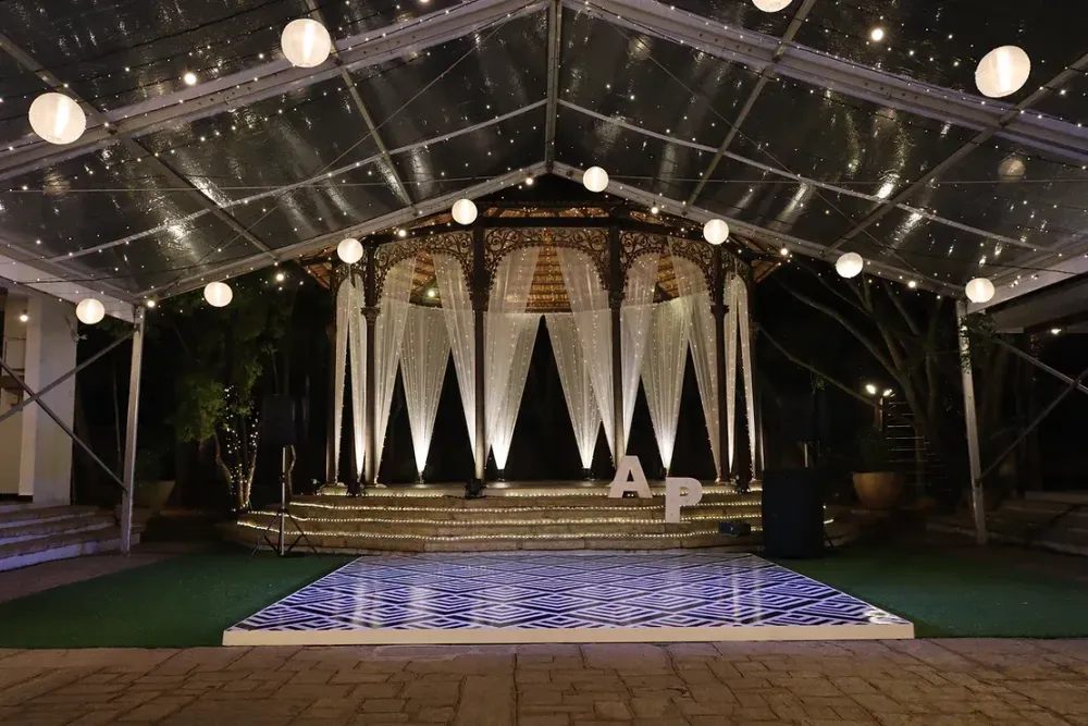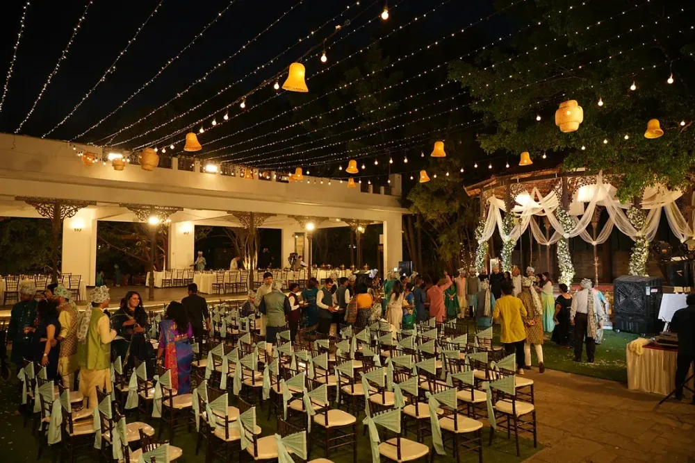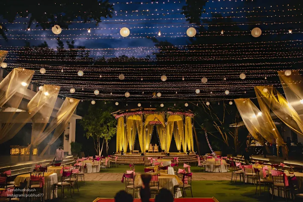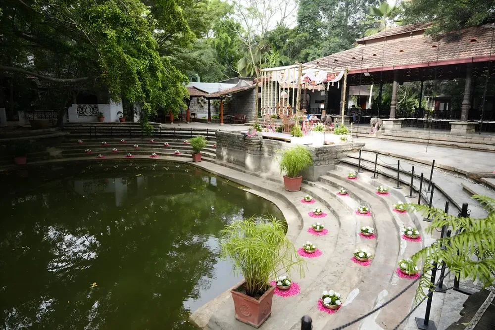 Also known as the 'Vishnu Mantapa', this intimate space has a Vishnu sculpture at its centre. Great for small gatherings with a vintage door as its backdrop, surrounded by greenery.