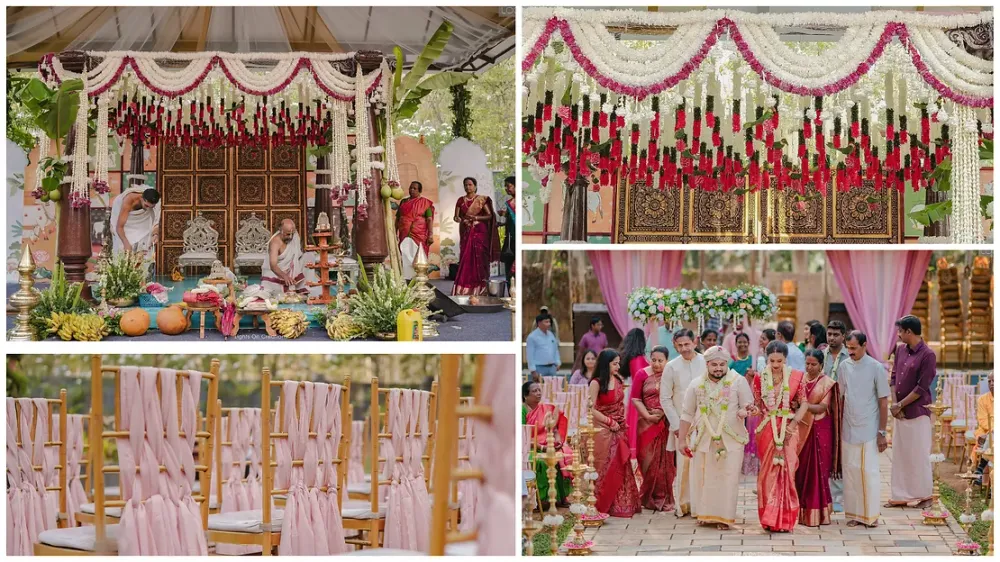 The vibrant red and white palette exuded auspiciousness, while touches of pink, gold, and green added a sophisticated elegance. Brass lamps adorned the walkway, leading to a stunning backdrop featuring a vintage door and printed sunboards that framed the mandap for the wedding rituals. The ceiling of the mandap was adorned with a display of various flowers and intricately crafted parrots made from coconut leaves, while fresh coconut leaves were tied to the wooden pillars, enhancing the organic beauty of the setting.