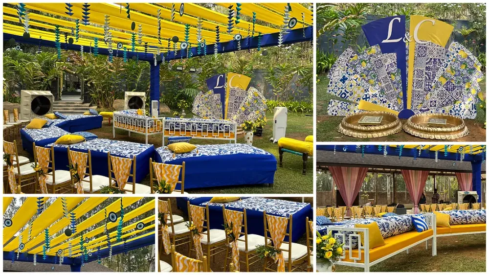 Continuing the Moroccan theme, the Haldi backdrop and seating arrangement had the typical Moroccan prints in the chosen colour palette. A bold blue added a wonderful contrast to the traditional yellow. Origami triangles with evil eyes hung from the ceiling: a little bit of whimsy while keeping unwanted gaze away. Keeping personalisation in mind, we also added the couples' initials on the backdrop.