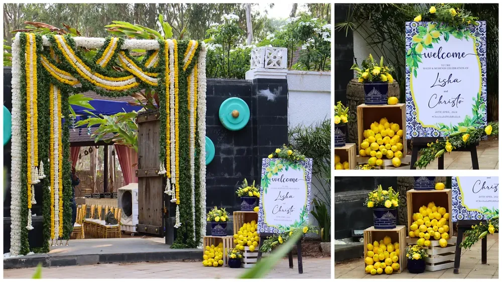 The haldi and mehendi event was far removed from your traditional yellow-only decor. The couple wanted a Moroccan theme and we made sure it was evident right from the entrance with the striking colour scheme. Spot the lemons, Moroccan printed welcome board and vases that added freshness and vibrancy.