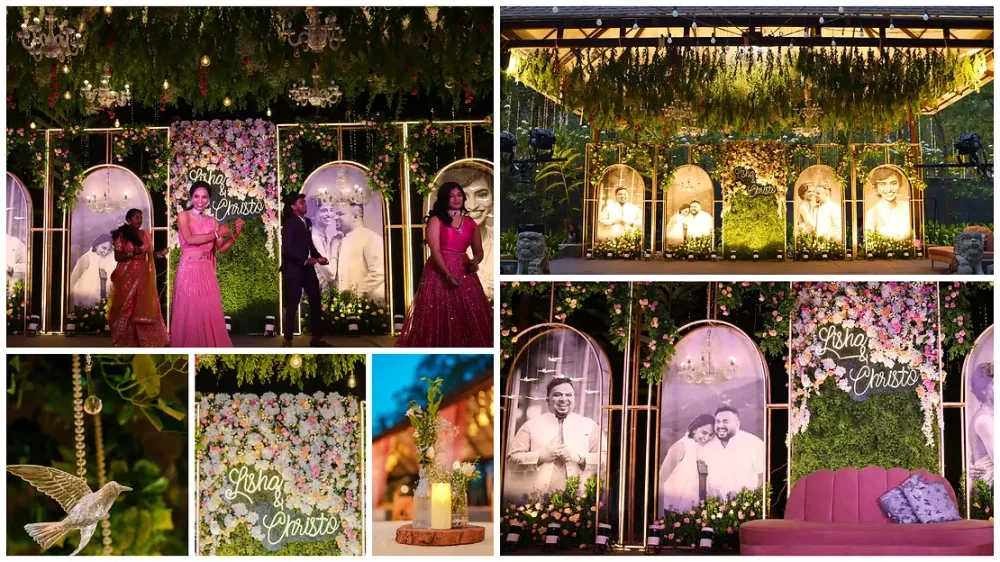 The couple had asked for personalization in their decor from the get-go so in the last event of the series, we made sure to hit it home. We showcased images of the couple on the stage backdrop and added their names in neon light. With flowers, leaves, glowing chandeliers, and crystal birds hanging from the ceiling, the entire stage was made to look enchanting.
